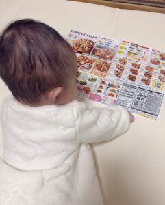 まだ生まれて間もない時期ながら、しっかりとした視線でピザのチラシを見つめる息子さん。