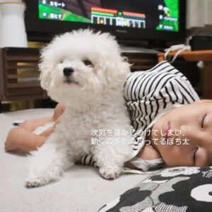 ぽち太くんを迎えた後、ママさんが3人目の子どもを出産すると、ぽち太くんは物音に敏感になり、吠えることが増えました。現在は、吠えないようトレーニング中だそうです。