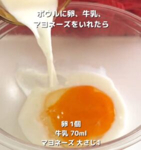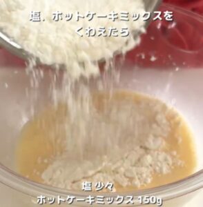 次に、ボウルに卵(1個)、牛乳(70ml)、マヨネーズ(大さじ1)を入れ、塩を少々とホットケーキミックス(150g)を加えて混ぜていきます。