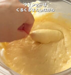 このとき、あまり混ぜすぎないことがポイント。ホットケーキミックスは混ぜすぎるとグルテンが出て生地がふっくらしづらくなるため、50〜60回ほど混ぜるのが目安です。生地が完成したら、ウインナーをくるくると回しながらつけていきます。