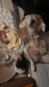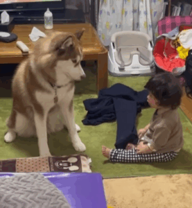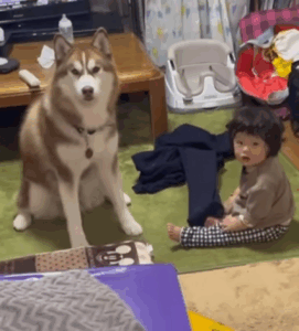兄弟のように育ってきた9ヶ月息子とハスキー犬。しかし…ばあばに怒られた直後、2人のまさかの行動に「そっくりだな」「コントか」