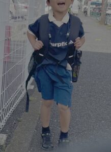 息子さんは、サッカーが大好きな元気いっぱいの男の子。普段の写真には、まき割りをする姿や、大きい荷物を持って歩く活発な様子が見られます。