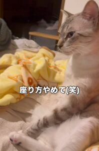 ルカちゃんは、ご飯中に構ってもらえないと背中を向けて拗ね、声をかけると顔だけ振り向いて鳴き、またそっぽを向く仕草が人間のようで思わず笑ってしまうそうです。動物番組の保護猫コーナーに夢中になったり、キャットタワーで寝転びながら驚いた表情を見せたりする姿も愛らしいといいます。座り方や寝方の独特な仕草もルカちゃんの魅力です。