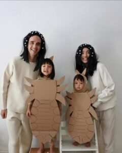 仮装のテーマは、有名デザイナーや食べ物、生き物など多岐にわたります。家族それぞれの衣装をバランスよくコーディネートしているのが特徴。