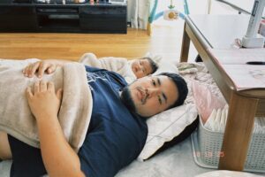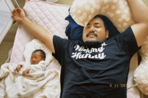 胸やお腹まわりが大きくなり、顔には口ひげとあごひげ。さらに、@tanao.08さんそっくりの赤ちゃんが隣で寝ています。