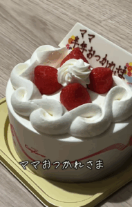 選ばれたケーキは、ママさんの大好きなお店のホールサイズのショートケーキ。開けた瞬間に見えた「ママお疲れ様」のメッセージにママさんは涙腺崩壊。この半年間の濃密な日々を労ってもらえたことが、本当に嬉しかったと話します。