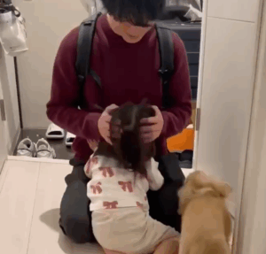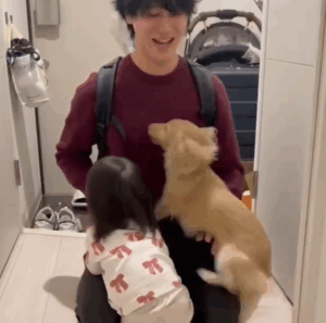玄関のドアが開いた瞬間、パパさんに抱きつく娘さんと、周りを走り回るちゃちゃちゃん。動画に映る2人の勢いは、“会いたかった気持ち”の大きさを表しているようでした。
