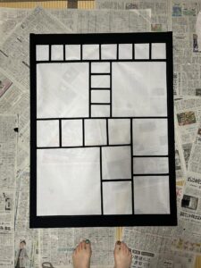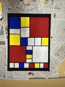 画材屋さんや100円ショップを回って材料を集めるなかで、大学時代に美術の授業で見たモンドリアンの『赤、青、黄色の構成』をふと思い出したといいます。