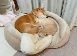投稿者さんの話によると、おかかくんは先住犬で、一緒に住む猫ちゃんは後から家族になったとのこと。