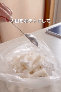 細切りした大根を袋に入れた後、片栗粉(大さじ3)と青のり(大さじ1)を入れてよく振ります。その後、米油で揚げ焼きにして、塩をかけたら完成です。