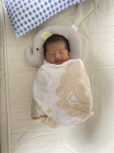 様子を見に行くと、布団の上で元気いっぱいに手足をバタバタと動かしている息子さん。