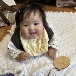 • よだれ掛けをじっくり見つめる5ヶ月娘。次の瞬間…思わず写真に収めた“まさかの行動”に「可愛すぎる」「尊い」「わかるんだね」