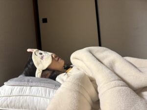お父さんが出かけてからわずか1分後、お母さんは予想外の光景を目にします。なんと、娘さんは先ほどまでの様子とは打って変わって、アイマスクをつけて眠っていたのでした。
