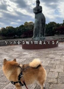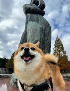 その後もあずきちゃんは、銅像の周りをウロウロしながら警戒を続けます。少し怖いのか、うなりながらもじわじわと距離を縮める姿が、なんともかわいらしいですね。