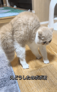 全身の毛を逆立て、身体を弓なりにしたまま動かないボボくん。