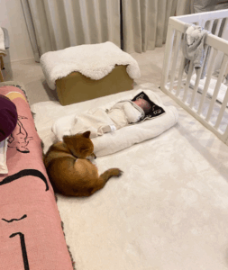 息子さんがリビングで寝ていると、みそちゃんがじっと見つめていました。まるで赤ちゃんを優しく見守っているかのようです。