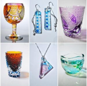 @tomokirikoさんは、今までに制作した作品について「アクセサリーは多くの方から好評で、切子ガラスを外でも楽しめるので作って良かったなと思います」と振り返ります。