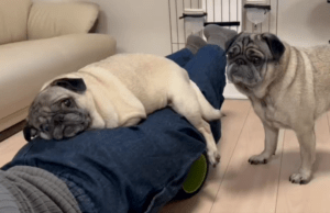 ある日、いつものようにローラーで前もものストレッチを始めた飼い主さん。すると、飼い犬のナンシーちゃんが飼い主さんの上に乗ってきました。