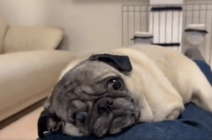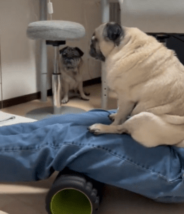 そのまま、ちょうど飼い主さんのおしりから太もものあたりで寝転び、リラックス。ローラーを前後に転がすことで生じる揺れをゆりかごのように楽しんでいたのでした。