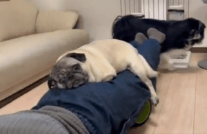 飼い主さんが2年前にローラーでストレッチを始めた頃から、飼い主さんの上に乗っているというナンシーちゃん。以来、ほぼ毎回のことなのだそう。