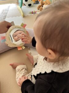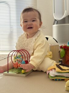 音や動き、つかみやすさなど、月齢にぴったりのおもちゃに好奇心いっぱいで向き合う娘さん。