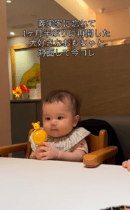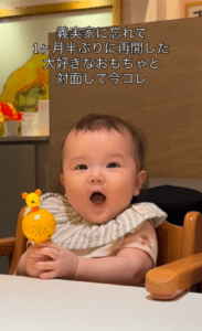 義実家にうっかり忘れてしまった娘さんのおもちゃ。1ヶ月半ぶりの再会で、目をキラキラさせる娘さんを見て「とっても表情豊かなので、毎日一緒にいられて幸せ」と感じたママさんでした。