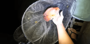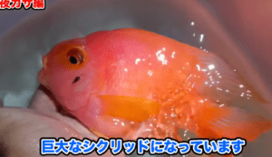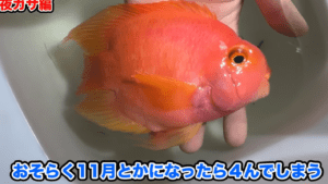 巨大金魚の正体は、台湾で品種改良された際に生まれた「パロットファイヤーシクリッド」。全長20cm超えの巨大魚で、美しい赤色が強調された張りのある個体でした。