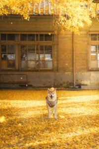 飼い主である(@sakodeoma)さんが、イチョウの葉が舞う中で撮った写真をThreadsに投稿。
