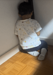 壁の隅の方に向かい、こちらに背を向け、隠れるようにしている息子さん。ママさんが声をかけても返事はありません。