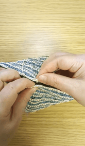 今回制作されたのは、三角形が立体的に構成された『テトラ型ポーチ』。もともとは、底を綴じたマチのないシンプルなポーチを制作していたそうです。