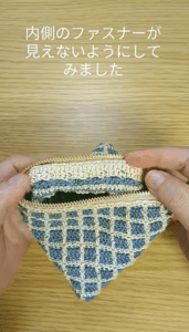 このポーチのこだわりは「ファスナー側から編み始める」という制作方法です。かぎ針編みのファスナーは、底から編んで最後に縫い付けたり、接着剤で固定したりする方法が一般的とのこと。