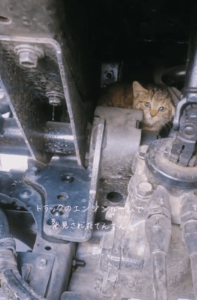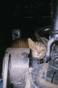キャビン下のエンジンルームを開けると、そこには小さな子猫がうずくまっていました。