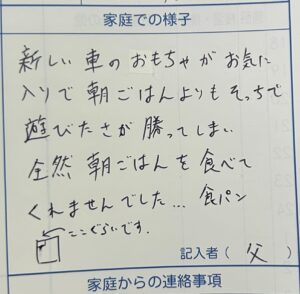しかし連絡帳を書くことは苦手なようで、ママさんが書く機会が多いようです。