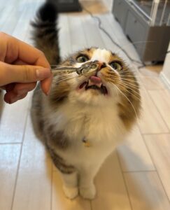 煮干しをもらうほたてくん(@hotanyanさんより提供)