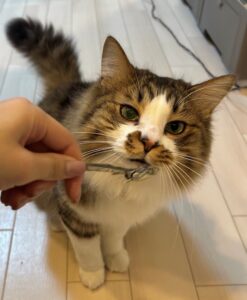飼い主さんが声をかけると、ほたてくんはゆっくりと振り返り、キャットタワーに片腕をかけるような体勢になったといいます。
