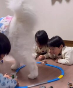 ママさんは、子どもたちが電車のおもちゃに夢中になって遊んでいる様子を撮影していました。すると、そこへサモエドのひるねちゃんがやって来て、線路の上をひょいっと横切ったのです。