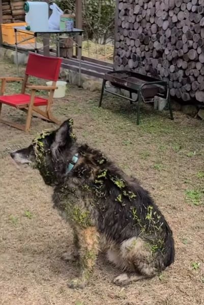 「犬が緑に変わるの初めて見た」遊びから帰ってくると体中が大変なことに…!? “小さい秋を見つけた犬”が可愛い…!
