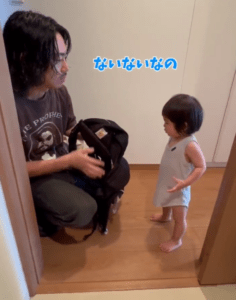 2024年10月に、当時1歳4ヶ月だった娘さんが抱っこ紐を持ってパパの前に立ちはだかる様子が紹介され、大きな反響を呼びました。