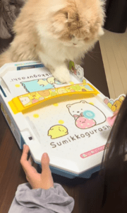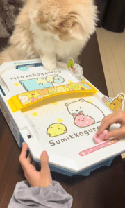 エアホッケー以外では「シャカシャカトンネル(中をくぐると音の鳴る猫用おもちゃ)や、羽の付いた猫じゃらしでよく遊びます」とのこと。