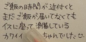 その内容は「ご飯の時間が近づくと、まだご飯が届いてなくてもイスに座って準備しているカワイイ〇〇ちゃんでした」というもの。
