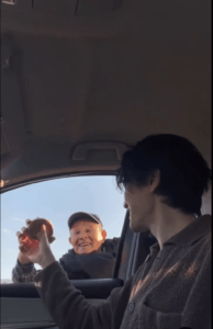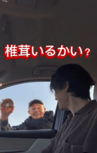 動画では、車を運転する男性(投稿者さん)に「シイタケいるかい?」と、ヒーローのように飛びながら現れて声をかけるおじいちゃんの姿が。