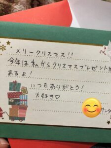 「大人のところには来ないね」と答え、その日は何事もなく過ぎていきました。ところが翌朝目を覚ますと、手紙とプレゼントが置かれていたといいます。