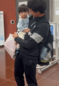 到着ロビーで待っていると、ついにパパさんが登場!こうして、息子さんは約1ヶ月ぶりに再会することができたのでした。