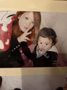 20年前の写真と現在の写真を並べて投稿したママさん。20年前の写真には、平成感あふれるメイクのママさんと一緒に1歳の息子さんが写っています。
