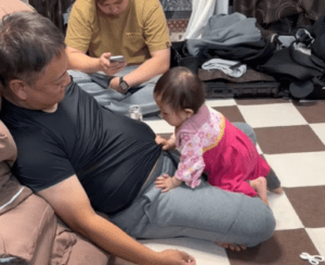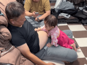 その様子が可愛く、カメラを回すと、お孫さんが迷いなく手を伸ばしたのはおじいちゃんの頭ではなく、お腹でした。