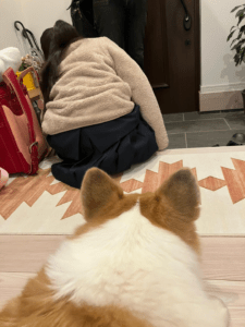 @kogi_musuさんが、娘さんとコーギーのグリコちゃんの日常のひとコマを「何やら紛れ込んでいる」とXに投稿したところ、話題になっています。