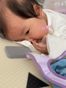 寝たフリに気づいて近づいたお母さんに対し、ここちゃんはバレてしまったと言わんばかりの、とびきりの笑顔を見せました。