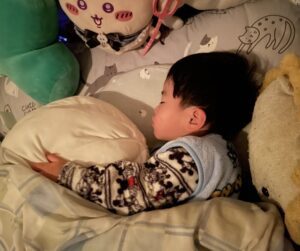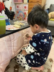 起きてきた四男さんは「グータッチでバイバイできなかった」と哀愁オーラ全開で座り込んで、しょんぼり。
