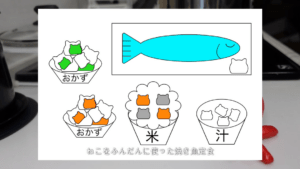 今回話題となったのは、@umi10231023さんが作ったサンマの塩焼き定食です。一見すると普通の和食定食ですが、ご飯やおかずの随所に猫ちゃんが隠れていました。