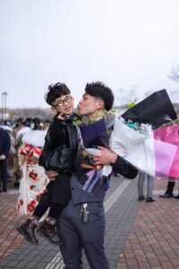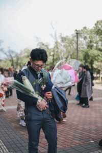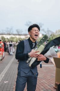 成人式に参加した次男。花束を抱えてると思い、よく見ると…「感慨深そうに抱えるんじゃないよwww」「イケメンだから余計に面白い」